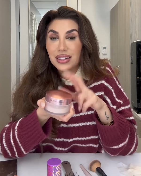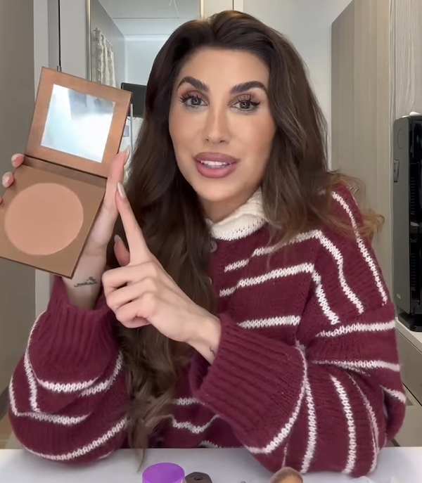 “This bronzer is the best. It’s actually for your body and your face, but I just love it for my face. It blends beautifully. I put it on my forehead, my cheeks… I chisel my jaw with it. And yes, you can also put it on your body!”